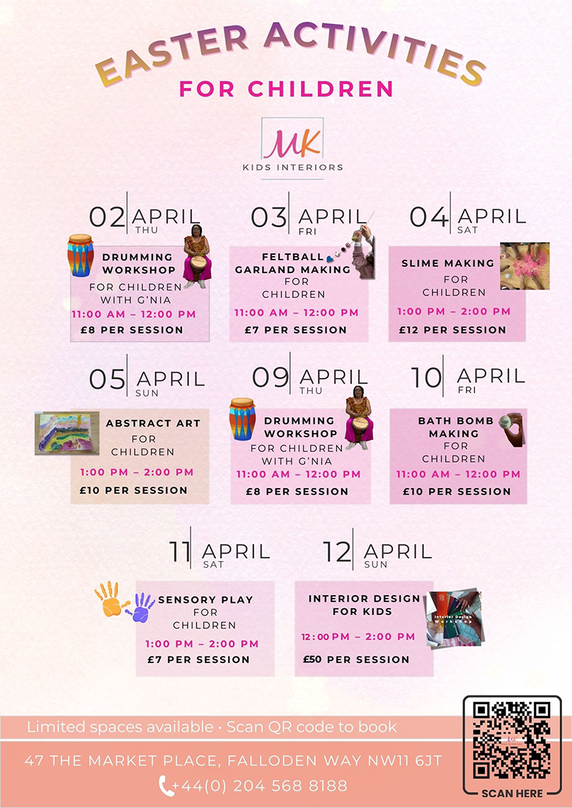 Join us this Easter for a series of creative workshops for children, designed to inspire imagination, creativity and fun. Hosted by MK Kids Interiors, each session offers a unique hands-on activity including wellness drumming, slime making, bath bomb making, sensory play, art and design workshops.